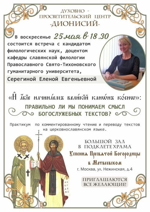 В воскресение, 25 мая, в 18.30 в подклете храма Успения Пресвятой Богородицы в Матвеевском состоится встреча с кандидатом филологических наук, доцентом кафедры славянской филологии ПСТГУ Еленой Евгеньевной Серегиной на тему «Правильно ли мы понимаем смысл богослужебных текстов?».