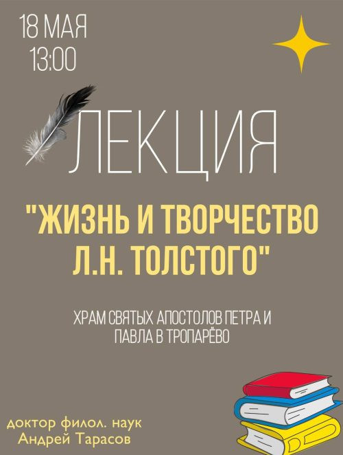 В храме святых апостолов Петра и Павла в Тропарёво 18 мая в 13:00 состоится лекция «Жизнь и творчество Л. Н. Толстого».