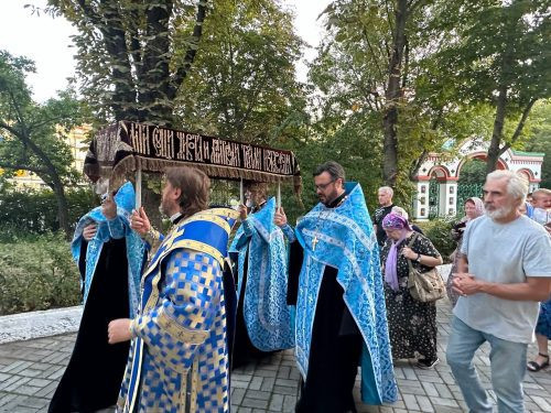 После великого славословия архиепископ Фома возглавил крестный ход с плащаницей с изображением Успения Пресвятой Богородицы.