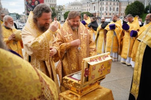 По сложившейся традиции, после Божественной литургии состоялись крестный ход из Успенского собора к памятнику равноапостольному великому князю Владимиру и торжественное молебное пение на Боровицкой площади. Ковчег с частицей мощей был изнесен крестным ходом на Боровицкую площадь и после молебна к нему был открыт доступ молящимся.