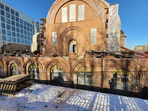 16 витражей монтируют в храме Трех святителей в Раменках. Стены и своды здания возведены, купола с крестами утверждены, кровля смонтирована. В этом году объект планируется ввести в эксплуатацию.