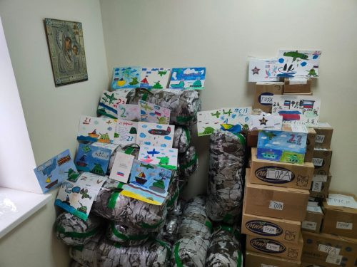 Это продукты питания, медикаменты, теплые вещи и сети, изготовленные в храме. А также письма детей воинам.