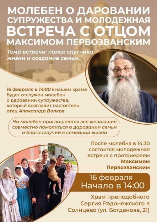 В воскресенье, 16 февраля, в храме прп. Сергия Радонежского в Солнцево состоится встреча с протоиереем Максимом Первозванским на тему: «Поиск спутника жизни и создание семьи».