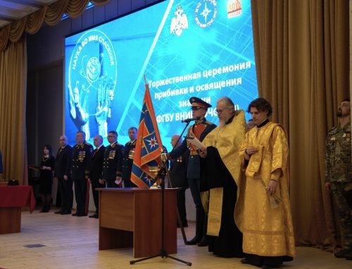 В актовом зале ФГБУ «Всероссийского научно-исследовательского института по проблемам гражданской обороны и чрезвычайных ситуаций МЧС России» (федеральный центр науки и высоких технологий) прошло торжественное освящение знамени, которое совершил настоятель храма Смоленской иконы Божией Матери в Фили-Давыдково протоиерей Леонид Олейников в сослужении диакона Анатолия Провады.