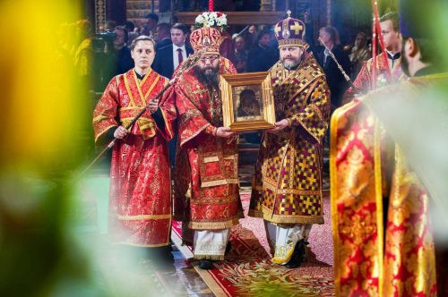 По традиции на великую вечерню было вынесено старинное напрестольное Евангелие времен императрицы Елизаветы Петровны, переданное по завещанию приснопамятного митрополита Питирима (Нечаева) из Иосифо-Волоцкого монастыря в дар Храму Христа Спасителя для особо торжественных праздничных богослужений.