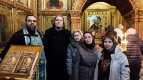 Клирик храма Патриаршего подворья святого великомученика Георгия Победоносца на Поклонной горе иерей Дионисий Лукин с директором воскресной школы «Росток» диаконом Тимофеем Рзяниным и приходским народным хором 28 января 2025 года Георгия Победоносца на Поклонной горе служение своей череды, молебного пения с акафистом Пресвятой Богородице в Иверской часовне на Красной площади города Москвы.