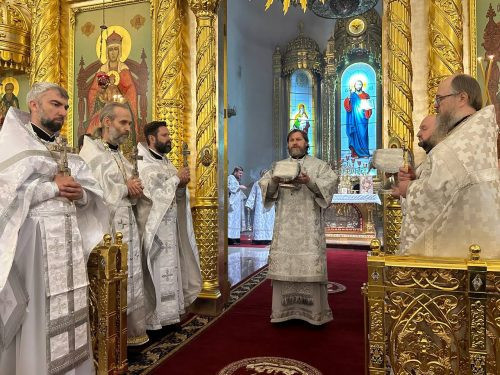 В алтаре собора владыка поздравил клириков с наградами и пожелал помощи Божией в служении Церкви. В конце богослужения владыка Фома обратился к молящимся со словами проповеди.