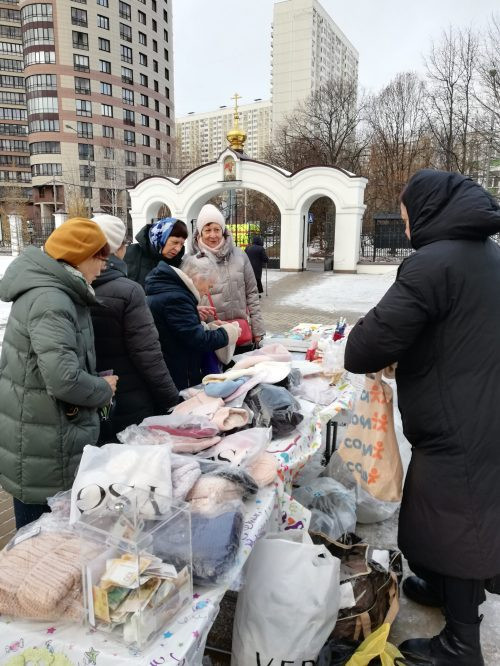 В воскресный день на территории храма Смоленской иконы Божией Матери в Фили-Давыдково состоялась благотворительная ярмарка, на которой были представлены: вязанные прихожанами крючком и на спицах шерстяные изделия, самодельные шитые детские игрушки. Православные книги, четки, ангелочки, нарядные чайные бокалы – выбор был и покупатели остались им довольны. Отдельный стол был отведен шапкам. Собранные денежные пожертвования, по окончании ярмарки, были переведены на закупку медикаментов для бойцов РФ принимающих участие на СВО.
