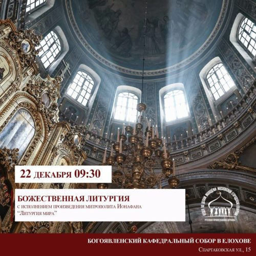 22 декабря 2024 года по благословению Святейшего Патриарха Московского и всея Руси Кирилла в Богоявленском кафедральном соборе в Елохове будет совершена Божественная литургия с исполнением произведения митрополита Ионафана «Литургия Мира». Начало богослужения – в 9:30.