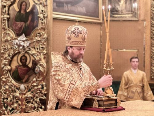 Его Высокопреосвященству сослужили клирики собора, а также ответственный за молодежное служение Западного викариатства иерей Илья Письменюк.
