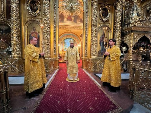 13 августа 2023 года, Неделю 10-ю по Пятидесятнице, Предпразднство Происхождения Честны́х Древ Животворящего Креста Господня, архиепископ Одинцовский и Красногорский Фома совершил Литургию в Богоявленском кафедральном соборе в Елохове.