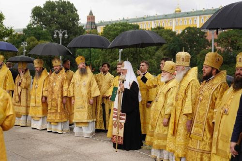По окончании молебна Предстоятель Русской Православной Церкви обратился к собравшимся на Боровицкой площади с Первосвятительским словом.