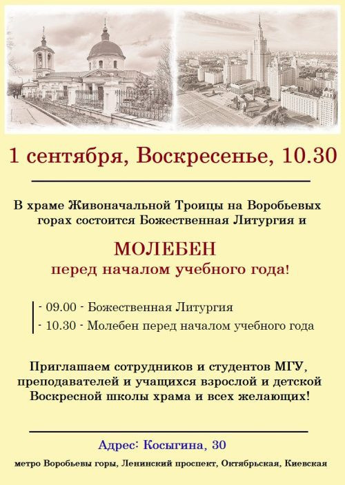 1 сентября в храме Живоначальной Троицы на Воробьевых горах состоится Божественная Литургия и молебен перед началом нового учебного года!