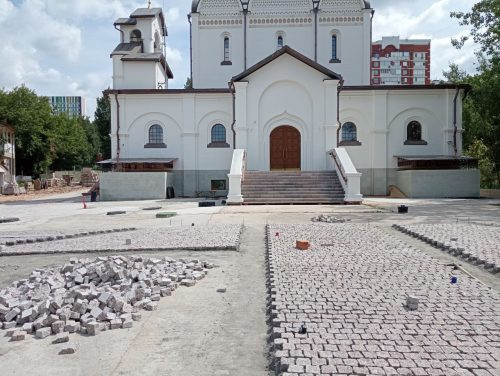 Продолжаются работы по благоукрашению приходской территории. У западного входа в храм рабочие начали укладывать гранитный камень – брусчатку.