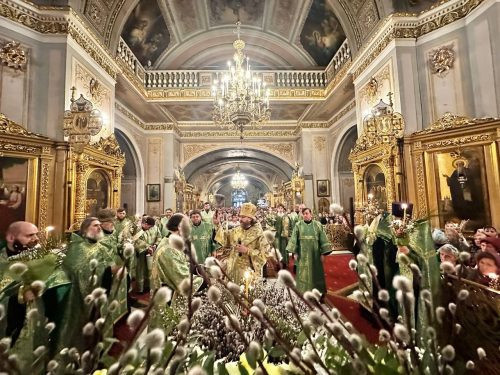 9 апреля 2023 года, Вход Господень в Иерусалим, архиепископ Одинцовский и Красногорский Фома совершил Божественную Литургию святителя Иоанна Златоуста в Георгиевском кафедральном соборе города Одинцово.
