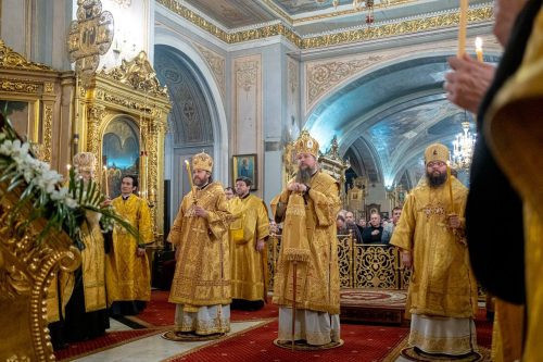 Митрополит Дионисий приветствовал Преосвященных архипастырей, сослужащее духовенство, прихожан собора и паломников с праздником. И передал первосвятительское благословение Святейшего Патриарха Московского и всея Руси Кирилла.