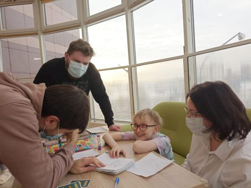 Программа этого визита включала настольные игры с подростками и творческий мастер-класс по изготовлению поделок из бумаги и игр для маленьких пациентов.