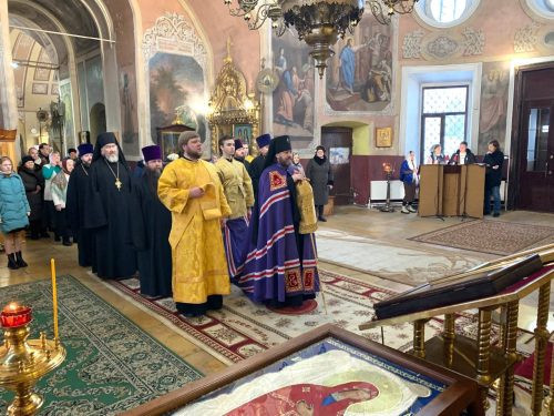 По окончании богослужения с приветственным словом к архиепископу Фоме обратился настоятель Введенского храма с. Спирово протоиерей Константин Попов и преподнес в дар панагию с изображением Волоколамской иконы Божией Матери.