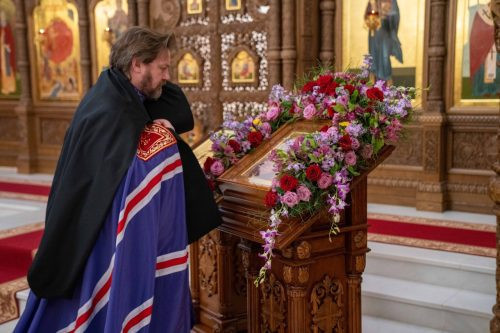 Настоятель храма протоиерей Илия Кочуров поблагодарил епископа Фому за совершенное в храме архиерейское богослужение и преподнес от прихода владыке букет цветов.