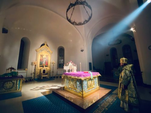 После сугубой ектении Владыка вознёс молитвы о Святой Руси и о здравии Святейшего Патриарха Московского и всея Руси Кирилла.
