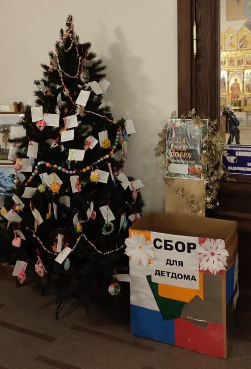 Пожелания о детских подарках к Рождеству развешаны на Елке в притворе храма. Там же стоит коробка для сбора подарков.