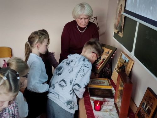 Дети очень живо откликнулись на вдохновенный рассказ и после окончания урока попросили разрешения рассмотреть и приложиться к иконам, перед которыми молился наш святой угодник.