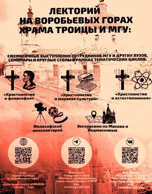 Лекторий храма Троицы на Воробьёвых горах и Московского государственного университета начинает 15-й семестр своей работы и приглашает всех желающих на свои мероприятия 2023-2024 учебного года!