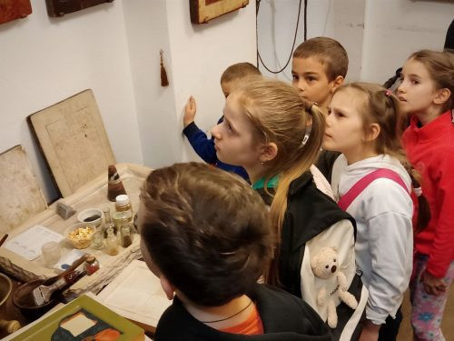 Дети смогли подержать в руках икону на разных этапах еë создания, рассмотреть камни, из которых получались пигменты для темперы, и даже потрогать кисть из шерсти волка.