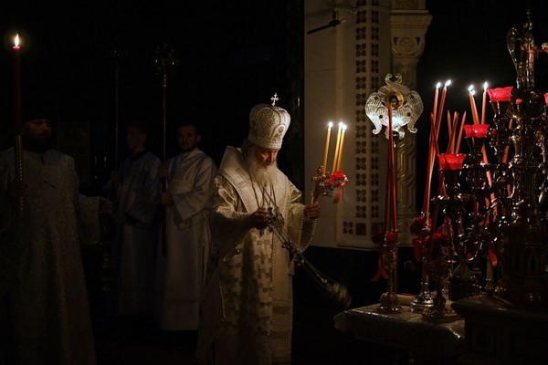 После пения стихир Пасхи владыка произнес Слово огласительное святителя Иоанна Златоуста на Святую Пасху.