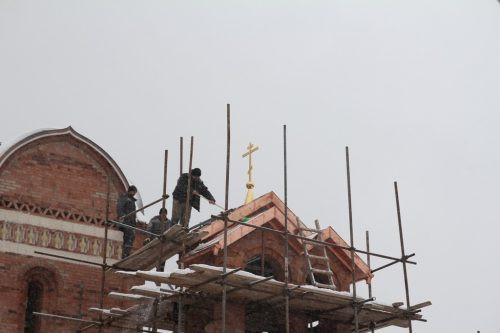 Крест звонницы вместе с крестом на центральный купол освятили еще осенью, в праздник Воздвижения, но сама звонница тогда была еще не готова. К весне звонницу отстроили и покрыли медной кровлей. Поскольку в Церкви два раза ничего не освящается, то под сводами нового храма отслужили молебен перед началом всякого благого дела.