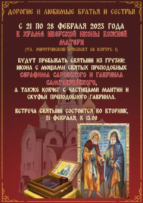 С 21 февраля по 28 февраля 2023 года в храме Иверской Иконы Божьей Матери в Очаково-Матвеевском пребывает святыни из Грузии: икона святых преподобных Гавриила Самтаврийского и Серафима Саровского с частицами мощей, а также ковчег с частицами мантии и скуфьи преподобного Гавриила. Святыни доступны для поклонения верующим.