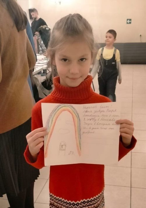 Тем временем дети приступили к важнейшей части мероприятия – к написанию писем. Ребята очень старались – каждое письмо написано от всей души. Часть написанных писем дети вложили в кармашки теплых кофт для воинов. А затем вместе с руководителем библиотеки Еленой прошли в храм и другую часть писем опустили в почтовый ящик, который установили при входе у иконы Покрова Пресвятой Богородицы.