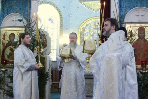 Высокопреосвященному настоятелю сослужили клирики храма.