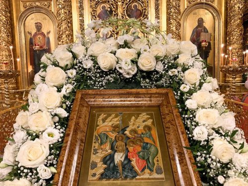Вместе с владыкой в Богоявленском кафедральном соборе в Елохове, накануне престольного праздника, молились клирики собора.