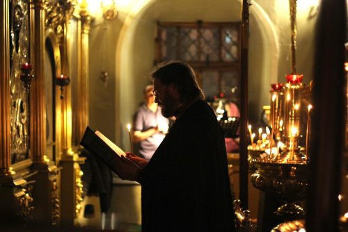 Вечерню и утреню с чтением акафиста Иисусу Сладчайшему совершил епископ Павлово-Посадский Фома в храме свт. Николая в Хамовниках