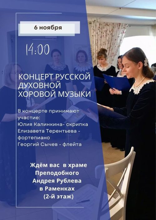 6 ноября, в воскресенье, в 14.00 на втором этаже храма преподобного Андрея Рублева состоится концерт приходского хора «Родник» под управлением Семичевой Тамары Яковлевны.