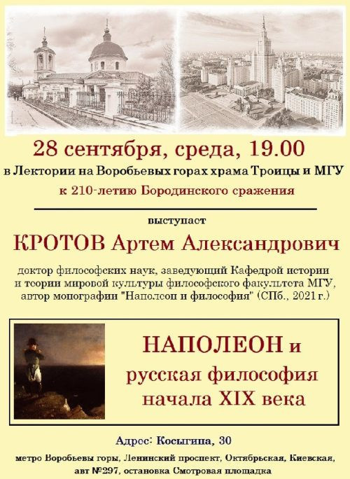 28 сентября, в среду, в 19.00 в Лектории на Воробьевых горах храма Троицы и МГУ к 210-летию Бородинского сражения выступит доктор философских наук, заведующий кафедрой истории и теории мировой культуры философского факультета МГУ, автор монографии «Наполеон и философия» (С-Пб., 2021г.), Артем Александрович Кротов.