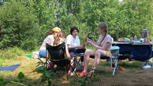 В этом году повезло с погодой: дети купались несколько раз в день. Как обычно, дежурные готовили еду и мыли посуду. Охраняли лагерь две гончие собаки — Джульетта и Нора.