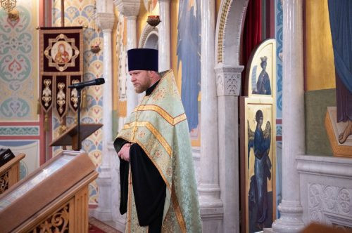 Всенощное бдение возглавил настоятель храма священник Александр Волков. Ему сослужили иерей Георгий Шаламберидзе, настоятель храма св. равноапостольной Ольги в Солнцеве, иерей Димитрий Каширин, и. о. настоятеля храма Серафима Саровского при Экспоцентре.