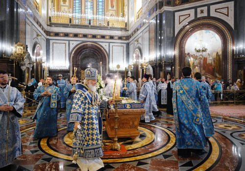 Епископ Фома сослужил Патриарху Кириллу за утреней с чином Погребения Пресвятой Богородицы