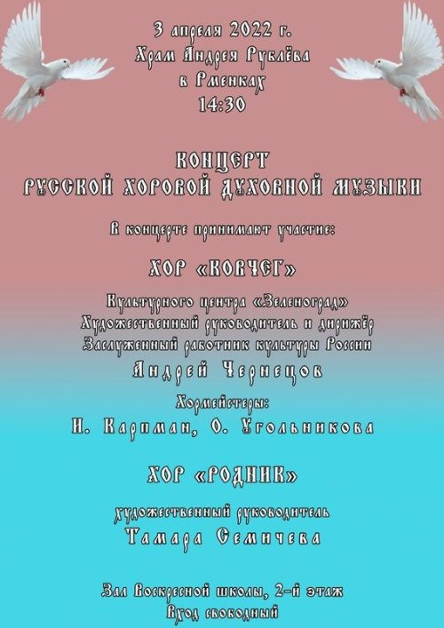 3-го апреля в 14.30 в концертном зале храма преподобного Андрея Рублева в Раменках состоится концерт русской хоровой духовной музыки.