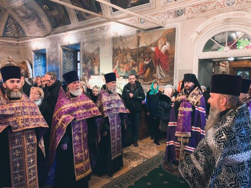 Его преосвященству сослужили: протопресвитер Владимир Диваков секретарь Патриарха Московского и всея Руси по г. Москве и клирики храма святителя Николая Мирликийского в Хамовниках.