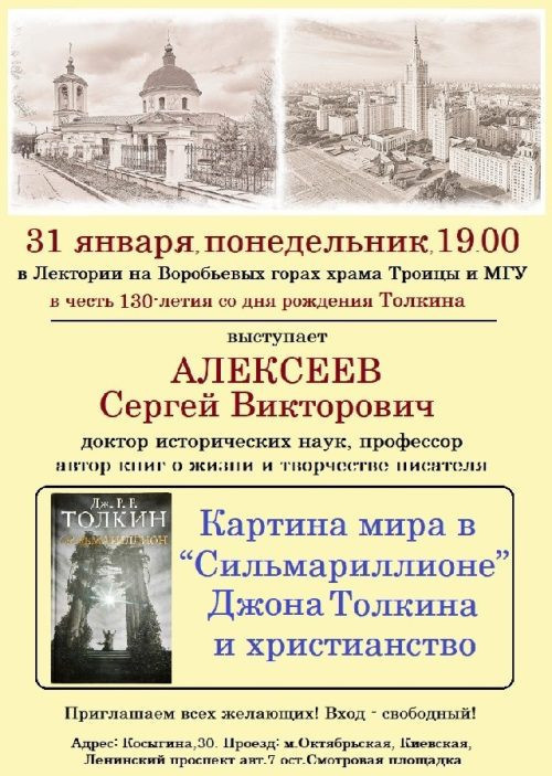 31 января 2022 года в 19.00 в Лектории на Воробьевых горах храма Троицы и МГУ к 130-летию Джона Толкиена, знаменитого английского филолога, лингвиста и писателя-фантаста, состоится выступление доктора исторических наук, профессора и автора книг о жизни и творчестве писателя Сергея Викторовича Алексеева.