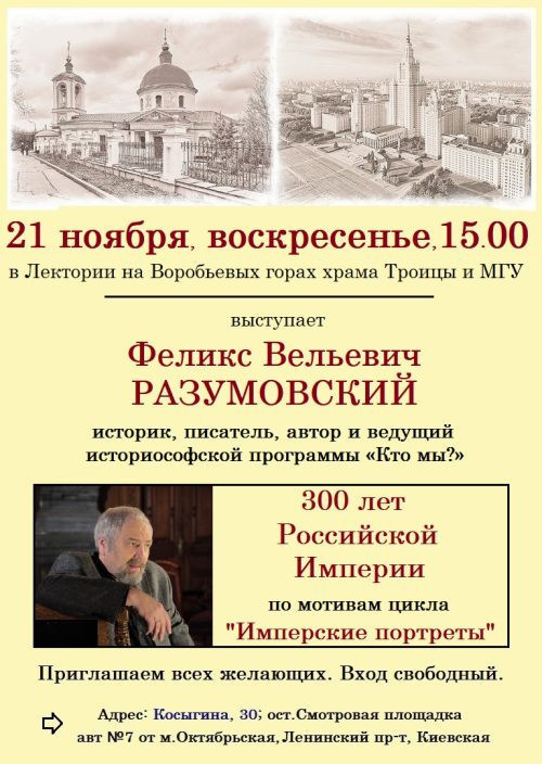 21 ноября, в воскресенье, в 15.00 в Лектории на Воробьевых горах храма Троицы и МГУ выступает Феликс Вельевич РАЗУМОВСКИЙ, историк, писатель, автор и ведущий историко-философской программы «Кто мы?» на телеканале «Культура».