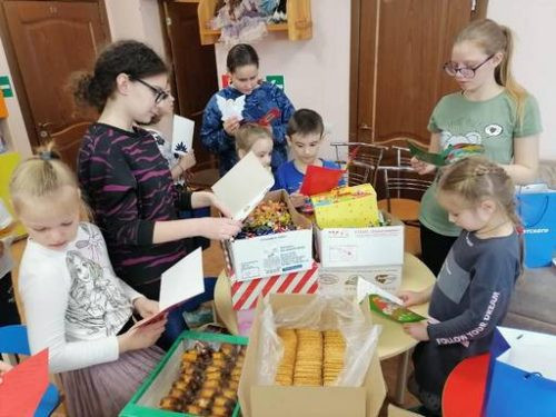 Самодельные открытки своим ровесникам передали воспитанники приходской воскресной школы «Одигитрия». Также ребятам передали сладости, книги, вещи.