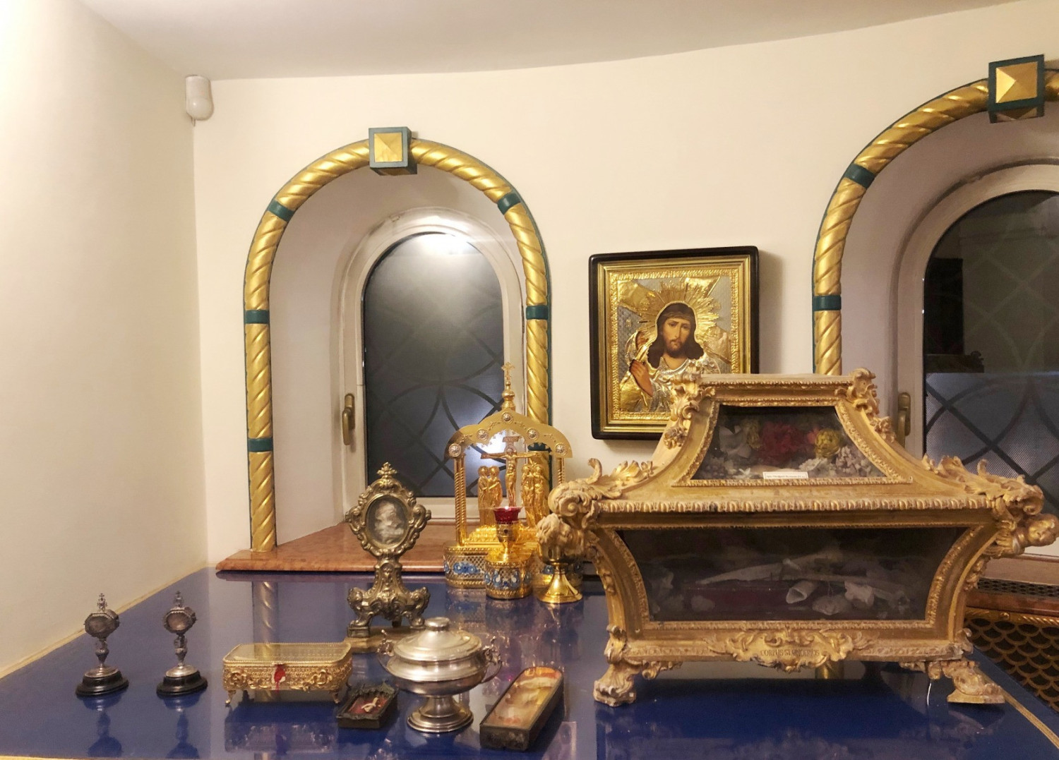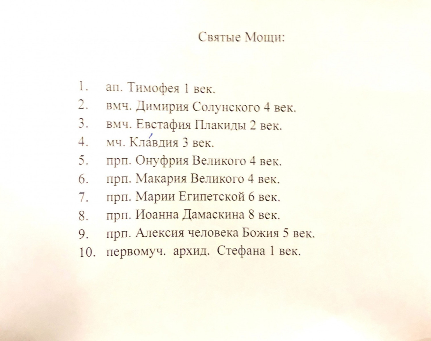 В дар храму Святейший Патриарх Кирилл передал ковчеги с честными мощами апостола Тимофея, великомученика Димитрия Солунского, великомученика Евстафия Плакиды, мученика Клавдия, преподобного Онуфрия Великого, преподобного Макария Великого, преподобной Марии Египетской, преподобного Иоанна Дамаскина, преподобного Алексия, человека Божия, первомученика архидиакона Стефана.