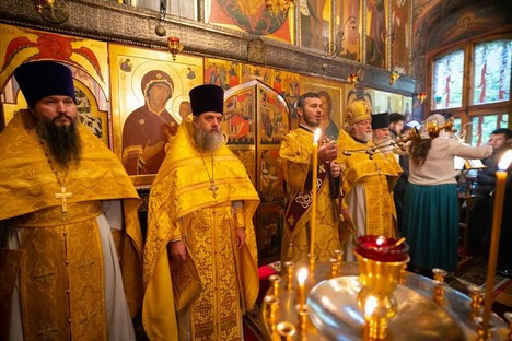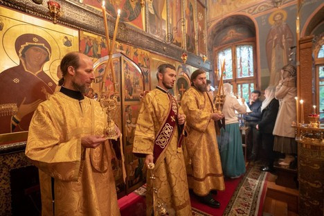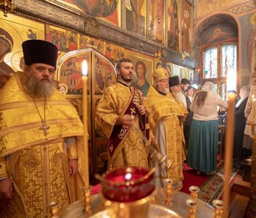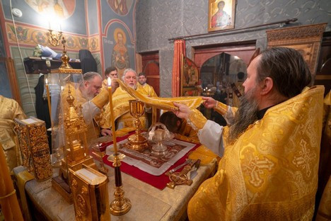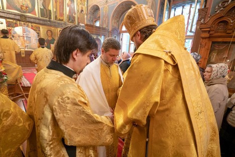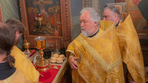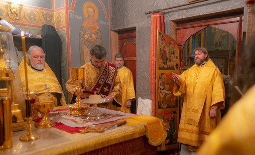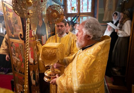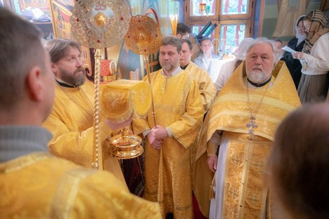 Его Преосвященству сослужили благочинный Михайловского церковного округа протоиерей Георгий Студенов, настоятель храма протоиерей Димитрий Иванов, клирик храма игумен Вадим (Рындюк), духовенство Западного викариатства.
