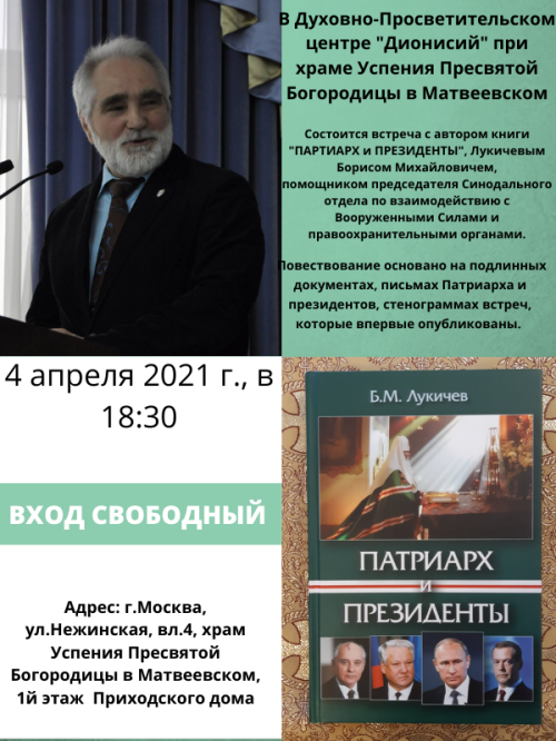 4 апреля в 18:30 в Духовно-просветительском центре «Дионисий» при храме Успения Пресвятой Богородицы в Матвеевском состоится встреча с Борисом Михайловичем Лукичевым, автором книги «Патриарх и президенты».