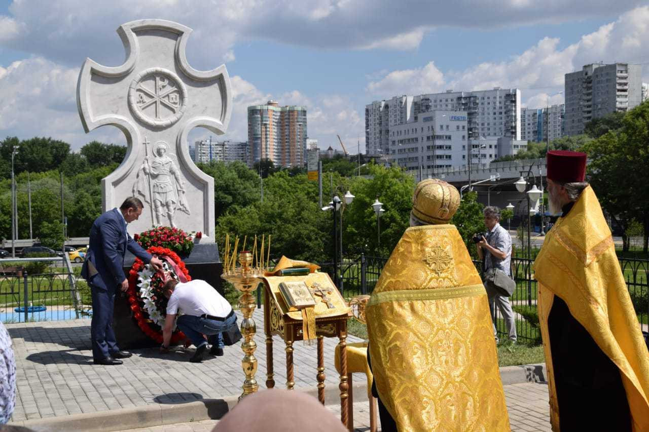 У храма Иверской иконы Божией Матери освятили поклонный крест в честь юбилея Победы
