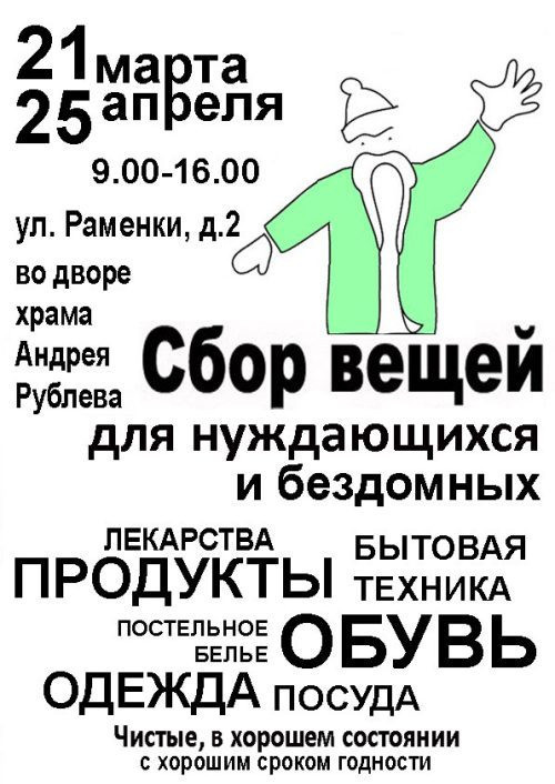 В субботу, 21 марта, с 9.00 до 16.00 во дворе храма прп. Андрея Рублева в Раменках состоится очередной сбор вещей и продуктов в пользу бездомных и нуждающихся.